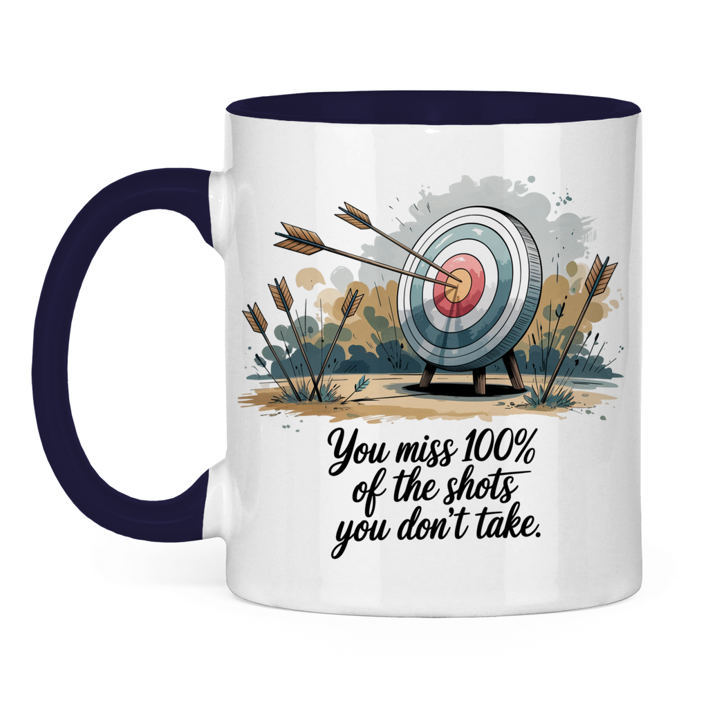 Unsere zweifarbige Sprüche Tasse mit dem Motiv „You miss 100% of the shots you don't take.“ sorgt für Motivation bei jeder Kaffeepause. Sie ist ideal, um sich selbst zu motivieren, oder als durchdachtes Geschenk für Kollegen, Freunde und Familie. Das hochwertige Druckverfahren kombiniert mit dem einzigartigen Watercolor-Design verleiht der Geschenk Tasse eine persönliche und ansprechende Optik. Dieses humorvolle Accessoire eignet sich hervorragend als besonderes Präsent zum Geburtstag, für das Team oder als kleine Aufmerksamkeit im Alltag.